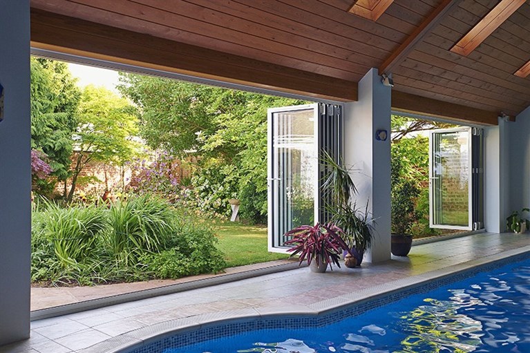 Mae drysau plygu’n cael eu gwneud o nifer o baneli unigol sy’n llithro’n dawel ac yn agor yn llyfn. Gallwch weld allan yn glir pan maent ar agor ac ar gau.